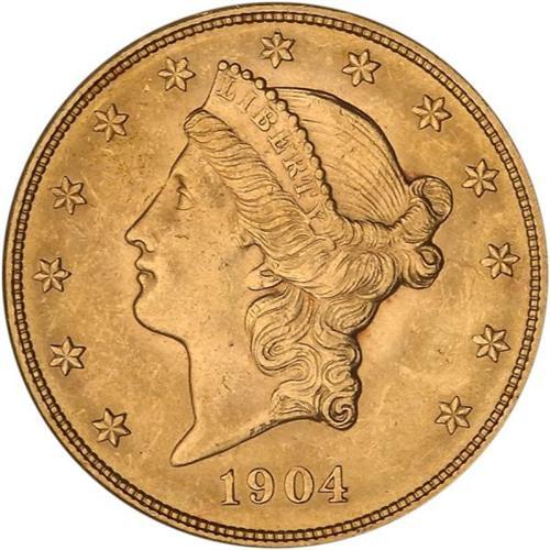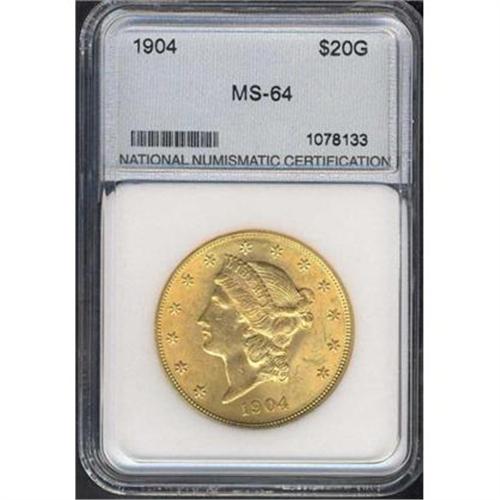 <b>1904 $20 Liberty. Net MS63.</b> (in a National Numismatic Certification holder grading MS64). The centers have a very pale apricot-red patina. A well struck example that has imposing luster and choice, lightly bagmarked surfaces that includes one small tic below the eye <b>(PCGS # 9045)</b>
