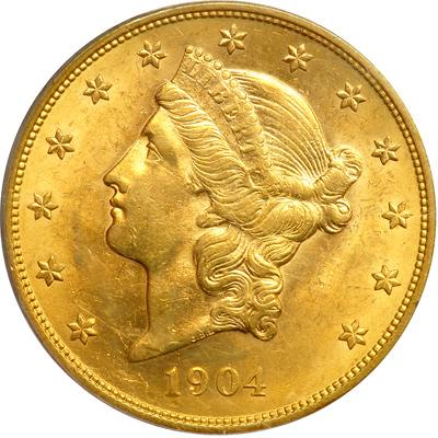 1904 $20 Liberty. PCGS graded MS-62. Old Green Holder. Intense golden orange shades are visible on both sides (PCGS # 9045) .