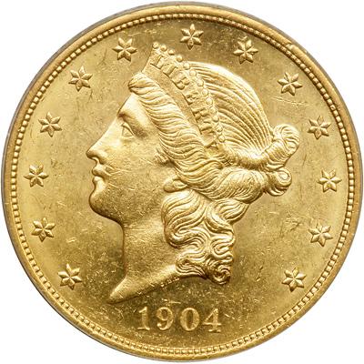 1904 $20 Liberty. PCGS graded MS-62. Predominantly untoned with a hint of golden shades here and there (PCGS # 9045) .