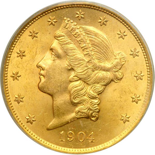 1904 $20 Liberty. PCGS graded MS-63 PQ. Housed in an Old Green Holder. Lovely rich golden toning and another example with rich mint luster which enhance the beauty of the color. Should be regraded to MS64 (PCGS # 9045) .