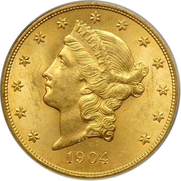 1904 $20 Liberty. PCGS graded MS-63. Housed in an Old Green Holder. Rich golden toning with splendid frosty luster (PCGS # 9045) .