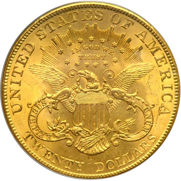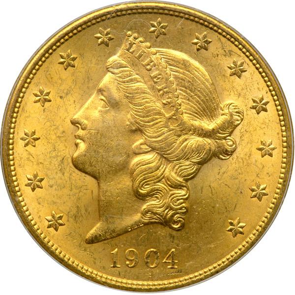 1904. PCGS graded MS-64. Lightly toned and fully lustrous. As most know, the price on these rises and falls with the "price" of gold, or rather, the price of the dollar versus a stable ounce of gold. A Double Eagle weighs ever so slightly less than a full ounce, net of the 10% copper alloy. To be specific, 0.9675 of an ounce of gold is in one (PCGS # 9045) .