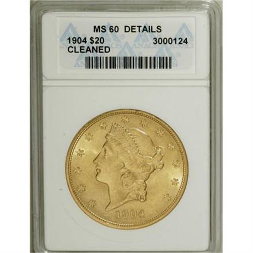 <B>1904 $20 --Cleaned--ANACS. MS60 Details.</B></I> NGC Census: (2689/161670). PCGS Population (3677/130692). Mintage: 6,256,797. Numismedia Wsl. Price for NGC/PCGS coin in MS60: $680. (#9045)<BR><BR><B>Coin Engraver:</B> James B. Longacre<BR><BR><b>Shipping:</b> Coins & Currency (<a target="_blank" href="http://www.heritageauctions.com/common/shipping.php">view shipping information</a>)