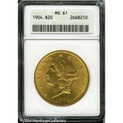 1904 $20 MS61 ANACS. Good color and luster, but a <B>1904 $20 MS61 ANACS.</B></I> Good color and luster, but a few small bagmarks consistent with the grade. <BR><BR><B>Important notice:</B> Heritage usually auctions material at the rate of 200-250 lots per hour. On some occasions eBay Live bid software or the Internet may not be able to keep up with the pace of the auction. We recommend placing a realistic absentee bid now as insurance to avoid disappointment. Occasionally the auctioneer may eliminate or reject an eBay Live bid, and the auctioneer may also reopen a lot after the close of the eBay live bidding (usually because we missed an audience bid), and may reject your bid even if it shows you as the winning bidder. By bidding via eBay Live, you agree that Heritage may award the lot to another bidder at its sole discretion under the circumstances described above or any other reasonable circumstances. Since eBay bids are not shown to us until we open the lot on the floor, we treat those bids just like floor bids. In most cases the floor responds before the eBay bid is presented to us, due to Internet lag time, so for consistency we have made it a policy that floor bids are always considered first over tie eBay live bids. Also please note that all Heritage lots purchased through eBay Live carry a 20% Buyer's Premium. Please make sure you read the Terms and Conditions before you bid. This lot is being auctioned in conjunction with a live floor auction by Heritage Galleries & Auctioneers. All final auction and invoice information will be supplied by Heritage Galleries & Auctioneers, and all other information should be considered preliminary. Lot:7029