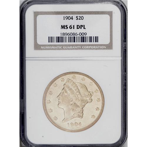 1904 $20 MS61 Deep Mirror Prooflike NGC. A boldly stru