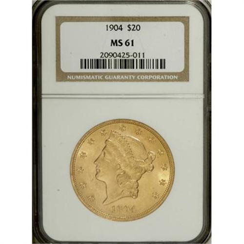<B>1904 $20 MS61 NGC.</B></I> NGC Census: (18776/142409). PCGS Population (14183/113948). Mintage: 6,256,797. Numismedia Wsl. Price for NGC/PCGS coin in MS61: $730. (#9045)<BR><BR><B>Coin Engraver:</B> James B. Longacre<BR><BR><b>Shipping:</b> Coins & Currency (<a target="_blank" href="http://www.heritageauctions.com/common/shipping.php">view shipping information</a>\)