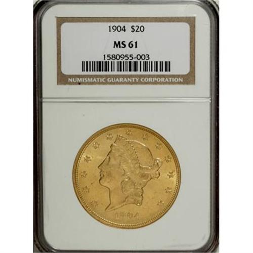 <B>1904 $20 MS61 NGC.</B></I> NGC Census: (18815/143064). PCGS Population (14186/116506). Mintage: 6,256,797. Numismedia Wsl. Price for NGC/PCGS coin in MS61: $715. (#9045)<BR><BR><B>Coin Engraver:</B> James B. Longacre<BR><BR><b>Shipping:</b> Coins & Currency (<a target="_blank" href="http://www.heritageauctions.com/common/shipping.php">view shipping information</a>)