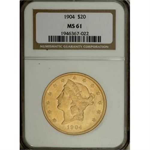 <B>1904 $20 MS61 NGC.</B></I> NGC Census: (19420/147919). PCGS Population (14340/122861). Mintage: 6,256,797. Numismedia Wsl. Price for NGC/PCGS coin in MS61: $1,040. (#9045)<BR><BR><B>Coin Engraver:</B> James B. Longacre<BR><BR><b>Shipping:</b> Coins & Currency (<a target="_blank" href="http://www.heritageauctions.com/common/shipping.php">view shipping information</a>)