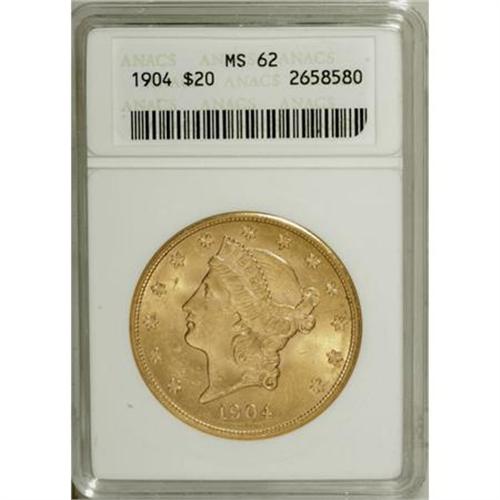 <B>1904 $20 MS62 ANACS.</B></I> NGC Census: (53228/89181). PCGS Population (45429/68519). Mintage: 6,256,797. Numismedia Wsl. Price for NGC/PCGS coin in MS62: $755. (#9045)<BR><BR><B>Coin Engraver:</B> James B. Longacre<BR><BR><b>Shipping:</b> Coins & Currency (<a target="_blank" href="http://www.heritageauctions.com/common/shipping.php">view shipping information</a>\)