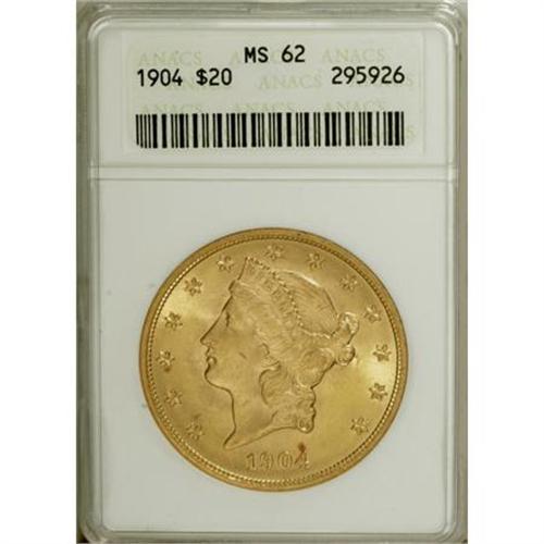 <B>1904 $20 MS62 ANACS.</B></I> NGC Census: (53581/90025). PCGS Population (46144/70845). Mintage: 6,256,797. Numismedia Wsl. Price for NGC/PCGS coin in MS62: $740. (#9045)<BR><BR><B>Coin Engraver:</B> James B. Longacre<BR><BR><b>Shipping:</b> Coins & Currency (<a target="_blank" href="http://www.heritageauctions.com/common/shipping.php">view shipping information</a>)