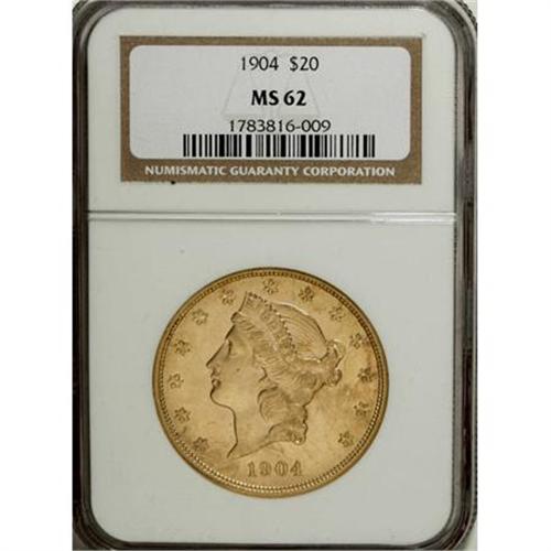 <B>1904 $20 MS62 NGC.</B></I> NGC Census: (53581/90025). PCGS Population (46268/71090). Mintage: 6,256,797. Numismedia Wsl. Price for NGC/PCGS coin in MS62: $740. (#9045)<BR><BR><B>Coin Engraver:</B> James B. Longacre<BR><BR><b>Shipping:</b> Coins & Currency (<a target="_blank" href="http://www.heritageauctions.com/common/shipping.php">view shipping information</a>)