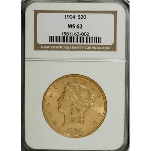 <B>1904 $20 MS62 NGC.</B></I> NGC Census: (53581/90025). PCGS Population (46484/72137). Mintage: 6,256,797. Numismedia Wsl. Price for NGC/PCGS coin in MS62: $740. (#9045)<BR><BR><B>Coin Engraver:</B> James B. Longacre<BR><BR><b>Shipping:</b> Coins & Currency (<a target="_blank" href="http://www.heritageauctions.com/common/shipping.php">view shipping information</a>)