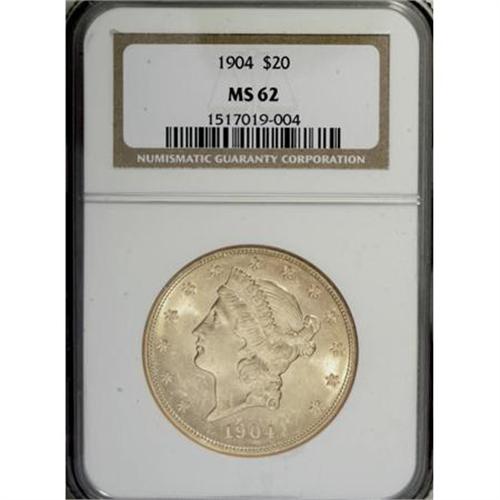 <B>1904 $20 MS62 NGC.</B></I> . NGC Census: (54774/91815). PCGS Population (47195/74077). Mintage: 6,256,797. Numismedia Wsl. Price for NGC/PCGS coin in MS62: $1,045. (#9045)<BR><BR><B>Coin Engraver:</B> James B. Longacre<BR><BR><b>Shipping:</b> Coins & Currency (<a target="_blank" href="http://www.heritageauctions.com/common/shipping.php">view shipping information</a>)