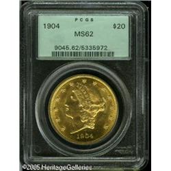 <B>1904 $20 MS62 PCGS.</B></I> Flashy luster and a bold strike are characteristic of this carefully preserved common date Double Eagle. Certified in a green label holder. Lot:9336