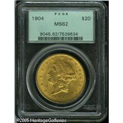 <B>1904 $20 MS62 PCGS.</B></I> Orange-gold colored with shifty luster that jumps from field to fields with tilted under a light. Lot:9352