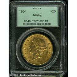 <B>1904 $20 MS62 PCGS.</B></I> Struck in orange-gold with numerous marks on both sides that preclude a finer designation. Lot:9341