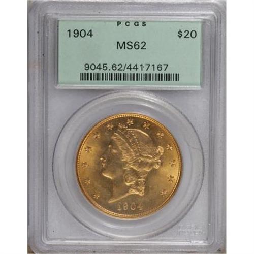 <B>1904 $20 MS62 PCGS.</B></I> PCGS Population (46033/70473). NGC Census: (53441/89623). Mintage: 6,256,797. Numismedia Wsl. Price for NGC/PCGS coin in MS62: $740. (#9045)<BR><BR><B>Coin Engraver:</B> James B. Longacre<BR><BR><b>Shipping:</b> Coins & Currency (<a target="_blank" href="http://www.heritageauctions.com/common/shipping.php">view shipping information</a>)
