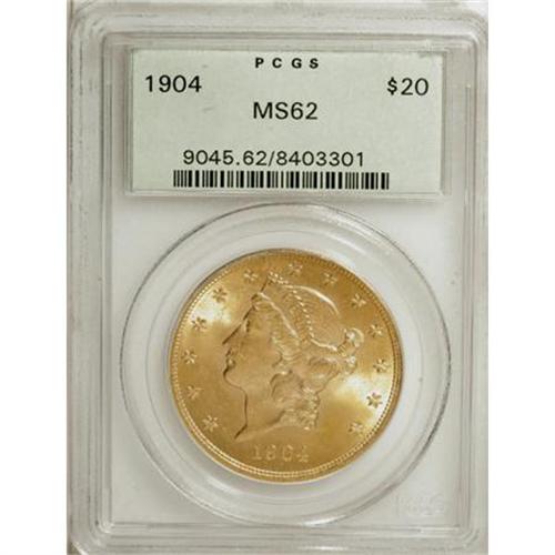 <B>1904 $20 MS62 PCGS.</B></I> PCGS Population (46984/73485). NGC Census: (54417/91220). Mintage: 6,256,797. Numismedia Wsl. Price for NGC/PCGS coin in MS62: $925. (#9045)<BR><BR><B>Coin Engraver:</B> James B. Longacre<BR><BR><b>Shipping:</b> Coins & Currency (<a target="_blank" href="http://www.heritageauctions.com/common/shipping.php">view shipping information</a>)