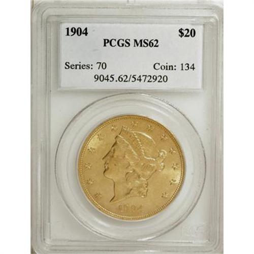 <B>1904 $20 MS62 PCGS.</B></I> PCGS Population (46984/73485). NGC Census: (54417/91220). Mintage: 6,256,797. Numismedia Wsl. Price for NGC/PCGS coin in MS62: $925. (#9045)<BR><BR><B>Coin Engraver:</B> James B. Longacre<BR><BR><b>Shipping:</b> Coins & Currency (<a target="_blank" href="http://www.heritageauctions.com/common/shipping.php">view shipping information</a>)