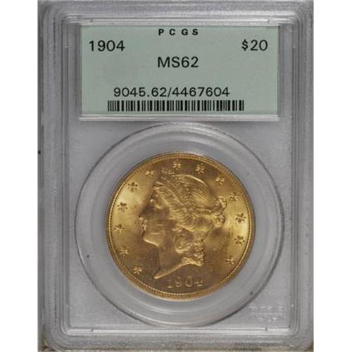 <B>1904 $20 MS62 PCGS.</B></I> PCGS Population (47424/74726). NGC Census: (54927/92065). Mintage: 6,256,797. Numismedia Wsl. Price for NGC/PCGS coin in MS62: $1,105. (#9045)<BR><BR><B>Coin Engraver:</B> James B. Longacre<BR><BR><b>Shipping:</b> Coins & Currency (<a target="_blank" href="http://www.heritageauctions.com/common/shipping.php">view shipping information</a>)