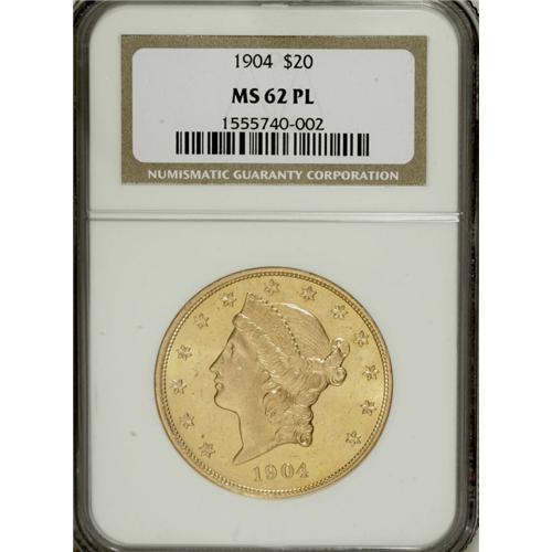 1904 $20 MS62 Prooflike NGC. A nicely reflective repre