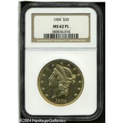 1904 $20 MS62 Prooflike NGC. A strongly mirrored a <B>1904 $20 MS62 Prooflike NGC.</B></I> A strongly mirrored and expertly struck common date Liberty Double Eagle that is moderately but not inordinately abraded. <BR><BR><B>Important notice:</B> Heritage usually auctions material at the rate of 200-250 lots per hour. On some occasions eBay Live bid software or the Internet may not be able to keep up with the pace of the auction. We recommend placing a realistic absentee bid now as insurance to avoid disappointment. Occasionally the auctioneer may eliminate or reject an eBay Live bid, and the auctioneer may also reopen a lot after the close of the eBay live bidding (usually because we missed an audience bid), and may reject your bid even if it shows you as the winning bidder. By bidding via eBay Live, you agree that Heritage may award the lot to another bidder at its sole discretion under the circumstances described above or any other reasonable circumstances. Since eBay bids are not shown to us until we open the lot on the floor, we treat those bids just like floor bids. In most cases the floor responds before the eBay bid is presented to us, due to Internet lag time, so for consistency we have made it a policy that floor bids are always considered first over tie eBay live bids. Also please note that all Heritage lots purchased through eBay Live carry a 20% Buyer's Premium. Please make sure you read the Terms and Conditions before you bid. This lot is being auctioned in conjunction with a live floor auction by Heritage Galleries & Auctioneers. All final auction and invoice information will be supplied by Heritage Galleries & Auctioneers, and all other information should be considered preliminary. Lot:7048