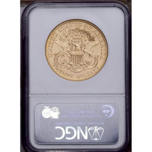 <B>1904<$20> MS62 Prooflike NGC.</B></I> Extremely brilliant and deeply mirrored on both sides, as expected, with what appears to be a smaller than expected number of light abrasions. The 1904 double eagle is omnipresent at coin shows and auctions due to its vast mintage exceeding 6 million pieces. NGC has graded more than 156,000 examples of the issue, yet only a bit more than 300 of them have received the Prooflike designation (4/06).
