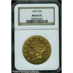 1904 $20 MS62 Prooflike NGC. This boldly struck ex <B>1904 $20 MS62 Prooflike NGC.</B></I> This boldly struck example has good eye appeal due to the absence of individually distracting blemishes. The fields are nicely reflective. <BR><BR><B>Important notice:</B> Heritage usually auctions material at the rate of 200-250 lots per hour. On some occasions eBay Live bid software or the Internet may not be able to keep up with the pace of the auction. We recommend placing a realistic absentee bid now as insurance to avoid disappointment. Occasionally the auctioneer may eliminate or reject an eBay Live bid, and the auctioneer may also reopen a lot after the close of the eBay live bidding (usually because we missed an audience bid), and may reject your bid even if it shows you as the winning bidder. By bidding via eBay Live, you agree that Heritage may award the lot to another bidder at its sole discretion under the circumstances described above or any other reasonable circumstances. Since eBay bids are not shown to us until we open the lot on the floor, we treat those bids just like floor bids. In most cases the floor responds before the eBay bid is presented to us, due to Internet lag time, so for consistency we have made it a policy that floor bids are always considered first over tie eBay live bids. Also please note that all Heritage lots purchased through eBay Live carry a 20% Buyer's Premium. Please make sure you read the Terms and Conditions before you bid. This lot is being auctioned in conjunction with a live floor auction by Heritage Galleries & Auctioneers. All final auction and invoice information will be supplied by Heritage Galleries & Auctioneers, and all other information should be considered preliminary. Lot:7047