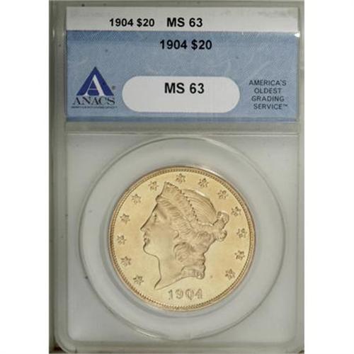 <B>1904 $20 MS63 ANACS.</B></I> . NGC Census: (58342/33473). PCGS Population (45012/29065). Mintage: 6,256,797. Numismedia Wsl. Price for NGC/PCGS coin in MS63: $1,325. (#9045)<BR><BR><B>Coin Engraver:</B> James B. Longacre<BR><BR><b>Shipping:</b> Coins & Currency (<a target="_blank" href="http://www.heritageauctions.com/common/shipping.php">view shipping information</a>)