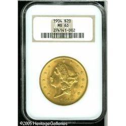 <B>1904 $20 MS63 NGC.</B></I> Sharply struck, with peach-gold patination over lustrous surfaces. Some scuffs on Liberty's cheek and in the obverse fields limit the grade. Lot:9369