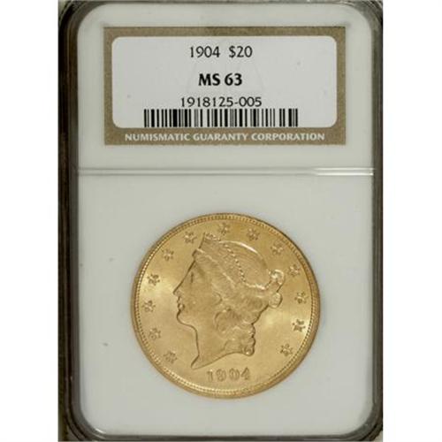 <B>1904 $20 MS63 NGC.</B></I> Unlike the usual representative of this generic issue, this example displays a dazzlingly frosty appearance on both sides. Well struck with light honey-gold toning and a few wispy blemishes on the obverse that define the grade. <BR><BR><b>Shipping:</b> Coins & Currency (<a target="_blank" href="http://www.heritageauctions.com/common/shipping.php">view shipping information</a>)