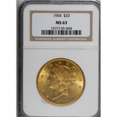 <B>1904 $20 MS63 NGC.</B></I> NGC Census: (57282/32743). PCGS Population (43908/27182). Mintage: 6,256,797. Numismedia Wsl. Price for NGC/PCGS coin in MS63: $890. (#9045)<BR><BR><B>Coin Engraver:</B> James B. Longacre<BR><BR><b>Shipping:</b> Coins & Currency (<a target="_blank" href="http://www.heritageauctions.com/common/shipping.php">view shipping information</a>)