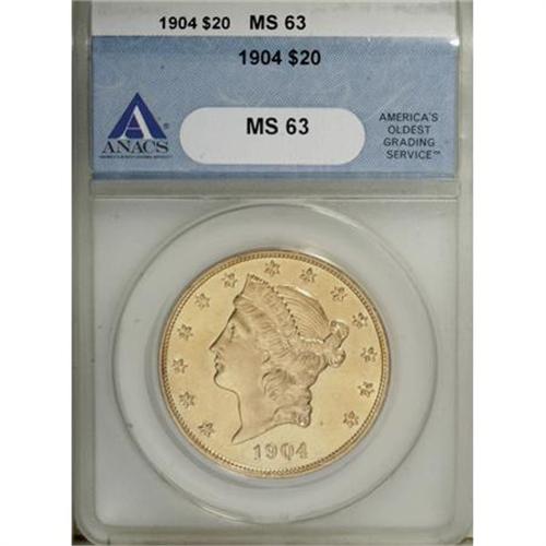 <B>1904 $20 MS63 NGC.</B></I> . NGC Census: (58342/33473). PCGS Population (45012/29065). Mintage: 6,256,797. Numismedia Wsl. Price for NGC/PCGS coin in MS63: $1,325. (#9045)<BR><BR><B>Coin Engraver:</B> James B. Longacre<BR><BR><b>Shipping:</b> Coins & Currency (<a target="_blank" href="http://www.heritageauctions.com/common/shipping.php">view shipping information</a>)