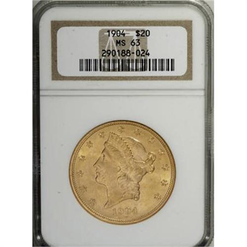 <B>1904 $20 MS63 NGC.</B></I> . NGC Census: (58342/33473). PCGS Population (45012/29065). Mintage: 6,256,797. Numismedia Wsl. Price for NGC/PCGS coin in MS63: $1,325. (#9045)<BR><BR><B>Coin Engraver:</B> James B. Longacre<BR><BR><b>Shipping:</b> Coins & Currency (<a target="_blank" href="http://www.heritageauctions.com/common/shipping.php">view shipping information</a>)