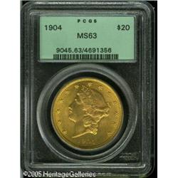 <B>1904 $20 MS63 PCGS.</B></I> Lovely apricot color embraces this lustrous and intricately struck type coin. The fields are refreshingly clean. In a prior generation holder. Lot:9359