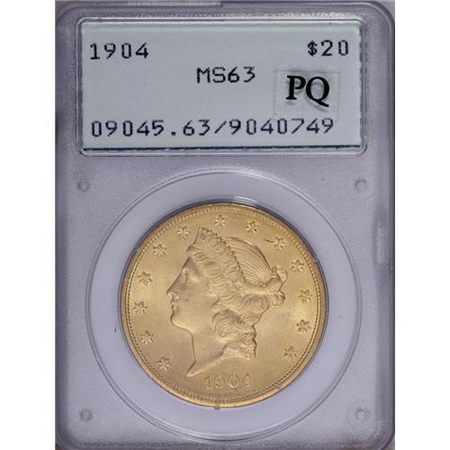 <B>1904 $20 MS63 PCGS.</B></I> Scintillating luster overwhelms the unusually smooth fields and devices. A beautiful Double Eagle, conservatively graded and located within a first generation holder.