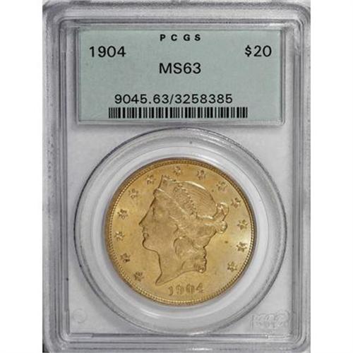 <B>1904 $20 MS63 PCGS.</B></I> Dazzling luster radiates from relatively smooth, peach-gold surfaces imbued with whispers of mint-green. Excellent definition results from a solid strike, further enhancing the coin's eye appeal. A sharp coin for the grade. Housed in a green-label holder.<B><BR></B></I><I>From the Reuben Reinstein Collection.</B></I><BR><BR><b>Shipping:</b> Coins & Currency (<a target="_blank" href="http://www.heritageauctions.com/common/shipping.php">view shipping information</a>)