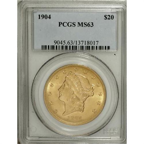 <B>1904 $20 MS63 PCGS.</B></I> PCGS Population (44030/27494). NGC Census: (57282/32743). Mintage: 6,256,797. Numismedia Wsl. Price for NGC/PCGS coin in MS63: $890. (#9045)<BR><BR><B>Coin Engraver:</B> James B. Longacre<BR><BR><b>Shipping:</b> Coins & Currency (<a target="_blank" href="http://www.heritageauctions.com/common/shipping.php">view shipping information</a>)