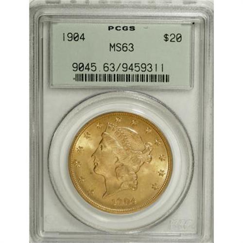 <B>1904 $20 MS63 PCGS.</B></I> PCGS Population (44177/27960). NGC Census: (57282/32743). Mintage: 6,256,797. Numismedia Wsl. Price for NGC/PCGS coin in MS63: $890. (#9045)<BR><BR><B>Coin Engraver:</B> James B. Longacre<BR><BR><b>Shipping:</b> Coins & Currency (<a target="_blank" href="http://www.heritageauctions.com/common/shipping.php">view shipping information</a>)