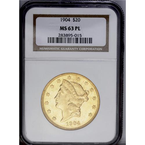 1904 $20 MS63 Prooflike NGC. Moderately reflective and