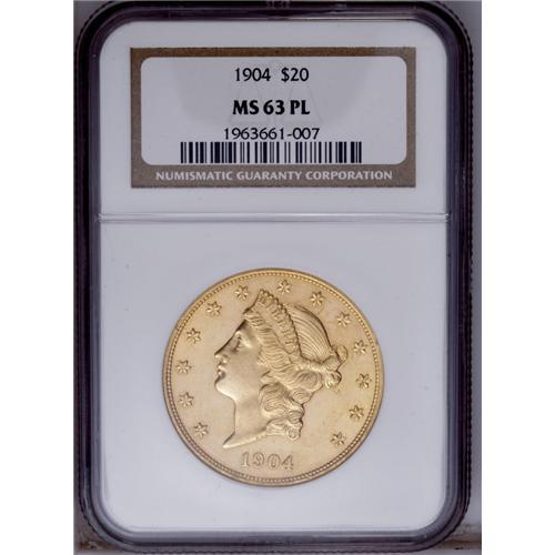 1904 $20 MS63 Prooflike NGC. Pretty apricot-gold patin 1904[$20] MS63 Prooflike NGC.