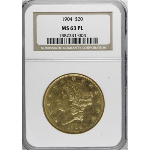 <B>1904 $20 MS63 Prooflike NGC.</B></I> A flashy canary-gold double eagle whose clean surfaces and crisp strike attest to the eye appeal. The 1904 is common, but prooflike examples comprise only a slender percentage of survivors.<BR><BR><b>Shipping:</b> Coins & Currency (<a target="_blank" href="http://www.heritageauctions.com/common/shipping.php">view shipping information</a>)