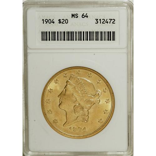 <B>1904 $20 MS64 ANACS.</B></I> Wonderful luster radiates from the peach-gold surfaces of this attractive near-Gem. A sharp strike complements the above attributes, enhancing the coin's overall eye appeal. Marks are few in number and low in intensity.<BR><BR><b>Shipping:</b> Coins & Currency (<a target="_blank" href="http://www.heritageauctions.com/common/shipping.php">view shipping information</a>)
