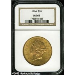 <B>1904 $20 MS64 NGC.</B></I> A beautiful Double Eagle that has the first glance appearance of a Gem. Only a thorough evaluation reveals a concealed pinscratch near 11 o'clock on the reverse. Lot:9383