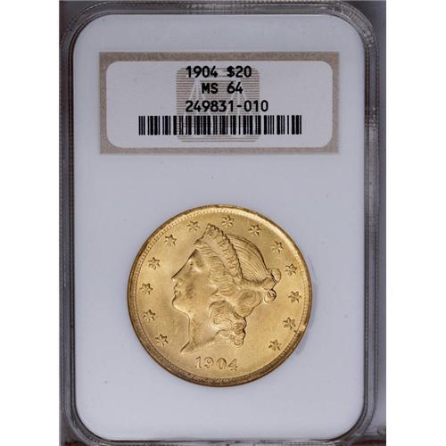 <B>1904<$20> MS64 NGC.</B></I> A beautifully preserved representative of this often encountered Liberty twenty dollar issue. Only the dentils are not well struck. A small obverse strike-through at 4 o'clock is of mint origin. Housed in a prior generation holder.