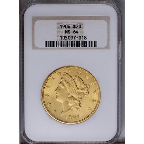 <B>1904<$20> MS64 NGC.</B></I> A flashy older holder near-Gem that benefits from an exacting strike and refreshingly smooth fields and devices.