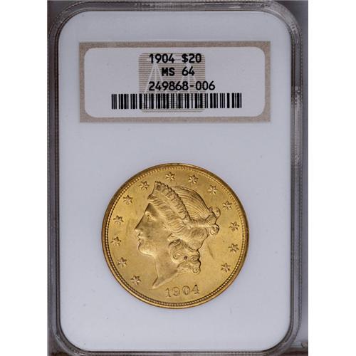 <B>1904<$20> MS64 NGC.</B></I> An impressive pumpkin-gold near-Gem that features dazzling luster and a clean reverse. The obverse field is also smooth for the grade. Housed in an older generation holder.