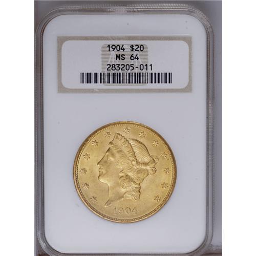 1904 $20 MS64 NGC. Bright, lustrous surfaces yield pre