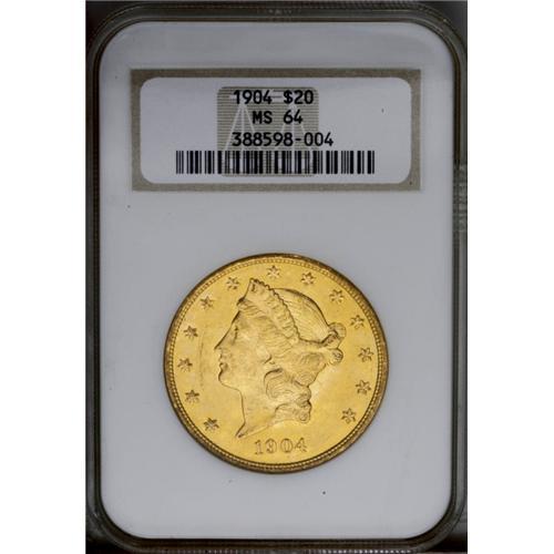<B>1904<$20> MS64 NGC.</B></I> Greenish-gold patina with sharply defined features and lightly abraded surfaces. A typical near-Gem example. <BR><BR><B>Important notice:</B> Heritage usually auctions material at the rate of 200-250 lots per hour. On some occasions eBay Live bid software or the Internet may not be able to keep up with the pace of the auction. We recommend placing a realistic absentee bid now as insurance to avoid disappointment. Occasionally the auctioneer may eliminate or reject an eBay Live bid, and the auctioneer may also reopen a lot after the close of the eBay live bidding (usually because we missed an audience bid), and may reject your bid even if it shows you as the winning bidder. By bidding via eBay Live, you agree that Heritage may award the lot to another bidder at its sole discretion under the circumstances described above or any other reasonable circumstances. Since eBay bids are not shown to us until we open the lot on the floor, we treat those bids just like floor bids. In most cases the floor responds before the eBay bid is presented to us, due to Internet lag time, so for consistency we have made it a policy that floor bids are always considered first over tie eBay live bids. Also please note that all Heritage lots purchased through eBay Live carry a 20% Buyer's Premium. Please make sure you read the Terms and Conditions before you bid. This lot is being auctioned in conjunction with a live floor auction by Heritage Galleries & Auctioneers. All final auction and invoice information will be supplied by Heritage Galleries & Auctioneers, and all other information should be considered preliminary. Lot:4466 <BR><BR><B>Winning Notification and Billing:</B> After the FINAL session in this auction is complete, Heritage will send e-mail and snail mail invoices. This process normally takes several days. All final auction and invoice information will be supplied by Heritage Galleries & Auctioneers, and all other information should be considered preliminary. <BR><BR>This auction will be conducted on a live auction floor and over the Internet through eBay Live. If you choose to place an absentee bid, please take a moment to <font color='#0000ff'><u><a href='http://pages.ebay.com/liveauctions/help/before/laabsentee.html'>learn how eBay Live absentee bidding works</a></u></font><font color='#000000'>