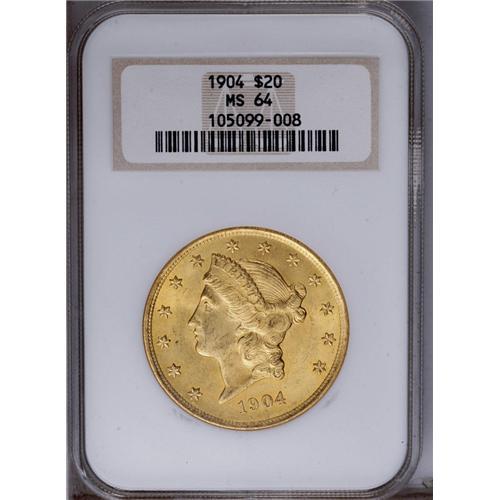 1904 $20 MS64 NGC. Mostly yellow-gold in color, with g 1904[$20] MS64 NGC.